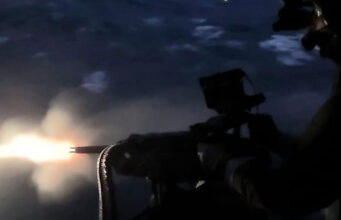 A Royal Navy Merlin helicopter of 814 NAS has carried out night-time gunnery training from HMS St Albans, with crews practising live weapons drills under low-light conditions as part of ongoing operational training.