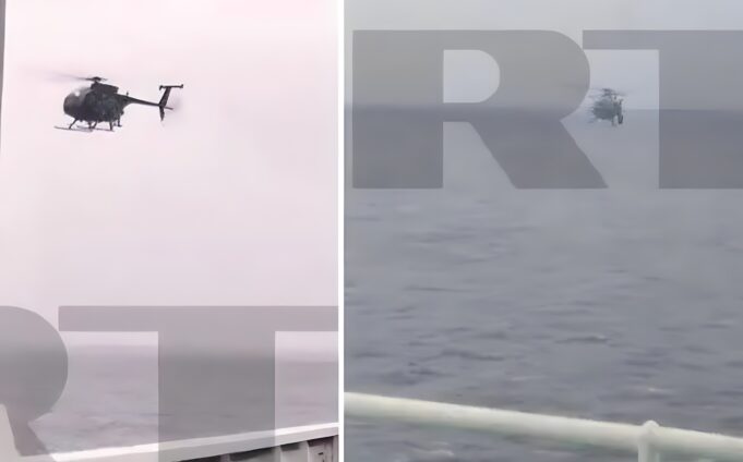An American military helicopter believed to be linked to U.S. special operations forces has been pictured operating alongside the sanctioned supertanker Marinera in the North Atlantic.