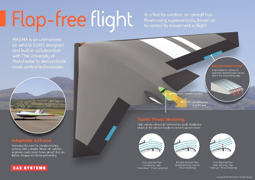 BAE say this process removes the need for complex movable flight control surfaces. In a series of ground-breaking flight trials that took place in the skies above north-west Wales, the MAGMA unmanned aerial vehicle (UAV) demonstrated two innovative flow control technologies which could revolutionise future aircraft design.
