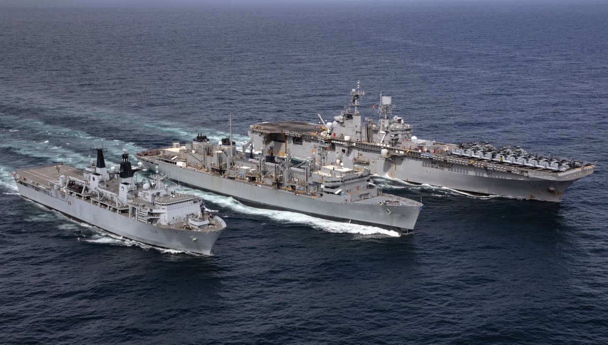 The Wasp-class amphibious assault ship USS Iwo Jima, right, the fast combat support ship USNS Supply and amphibious assault ship HMS Albion conducted a replenishment-at-sea this week.