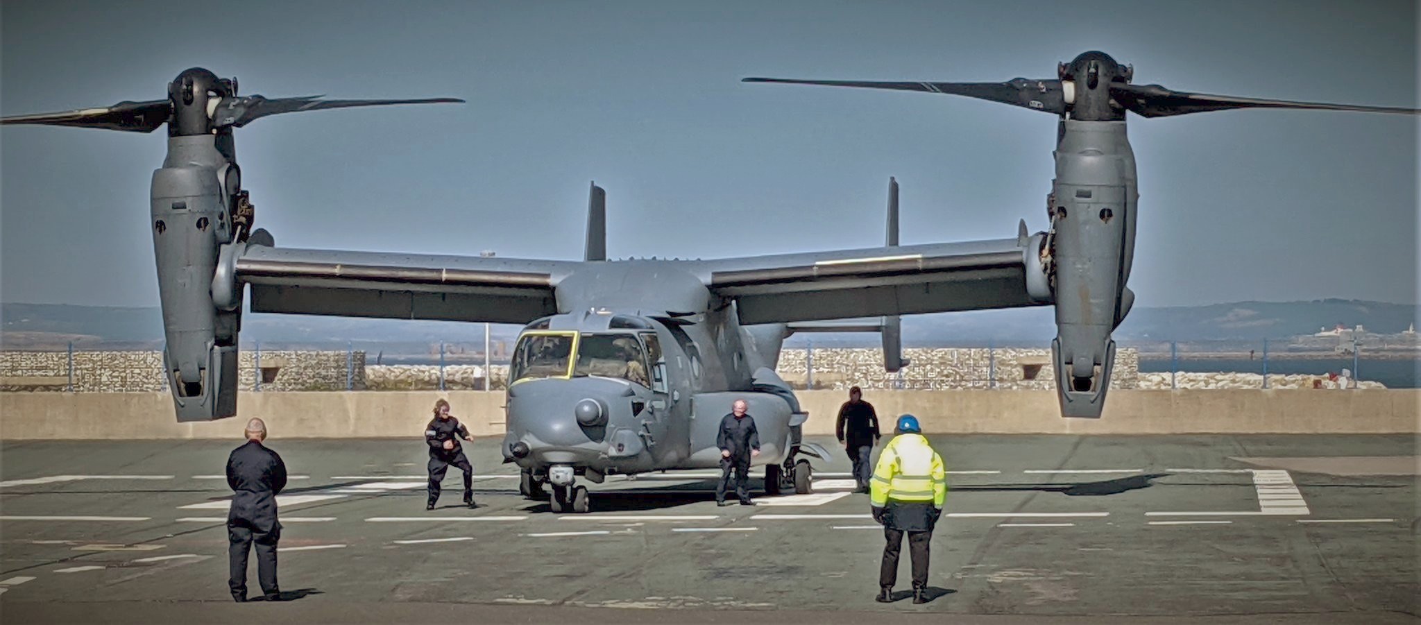 According to a news release on the Royal Navy website, the US Air Force’s 7th Special Operations Squadron dropped in on the support vessel off Portland with their MV-22 Osprey, the ‘tiltrotor’ which takes off and lands like a helicopter, then rotates its propellers to fly like a conventional aircraft.