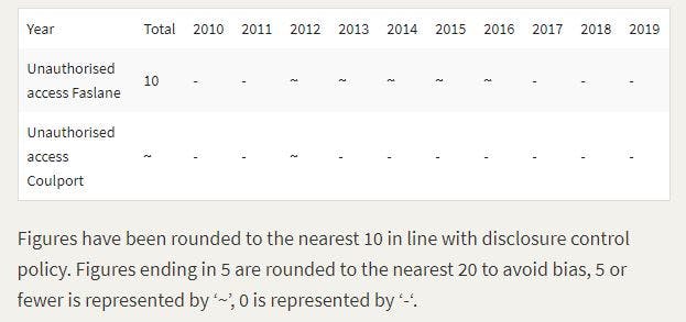 “The number of unauthorised access incidents at HMNB Clyde, Faslane and Royal Naval Armaments Depot Coulport, is provided in the table below: