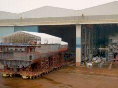 Work on HMS Cardiff, the second of eight Type 26 Frigates being built on the Clyde, is progressing as the stern block made a short move to meet the aft section of the ship in the build hall.