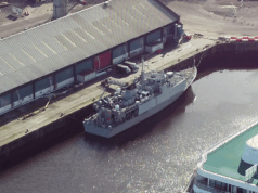 Drone footage shows HMS Penzance basking in the sun at the King George V docks in Glasgow.