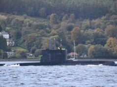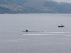 Drone footage shows the USS Califorinia, an American nuclear-powered submarine, sailing down the River Clyde after leaving Faslane naval base in Scotland.