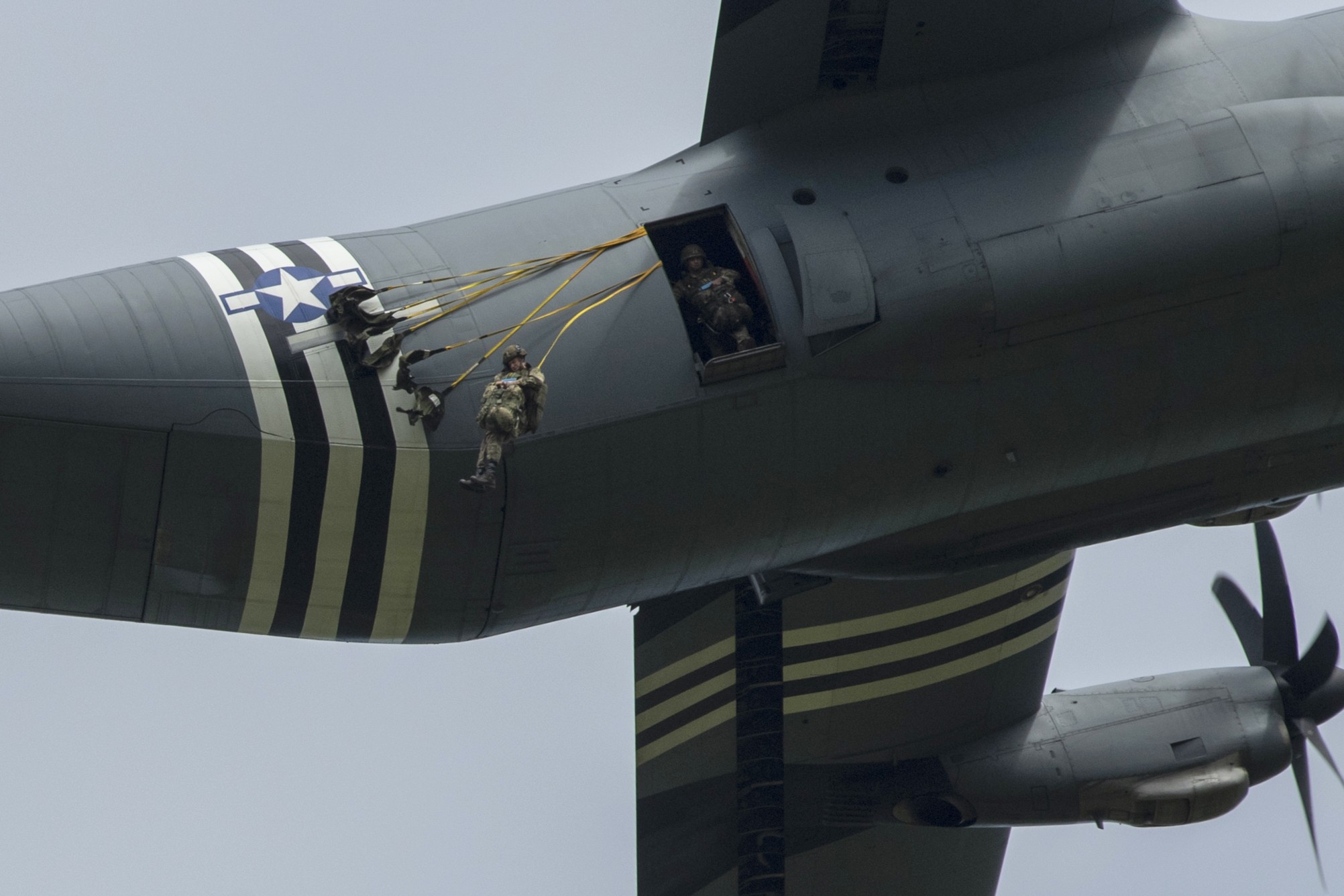 British soldiers parachute from US aircraft