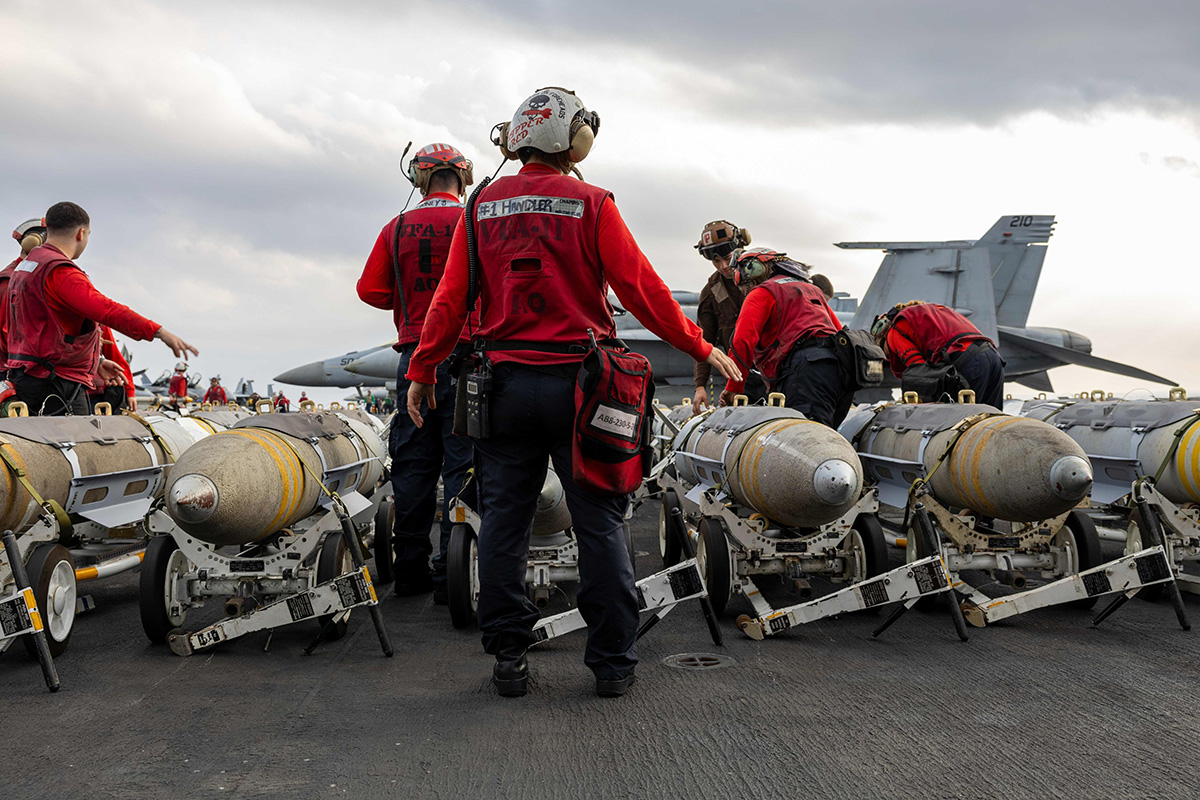 The photo, posted to CENTCOM’s official social media account, captures Navy ordnance crews — identifiable by their red shirts and helmets — arming carrier-based aircraft amid a backdrop of stormy skies and Super Hornet fighter jets.