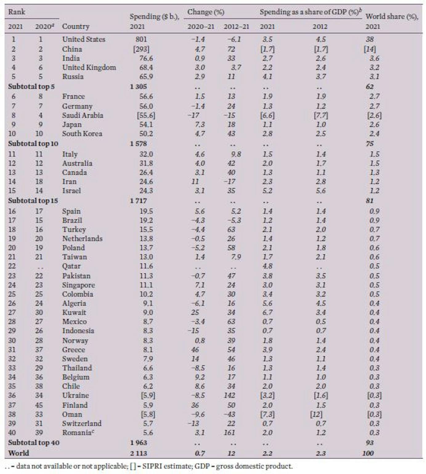 The five largest spenders in 2021 were the United States, China, India, the United Kingdom and Russia, together accounting for 62 per cent of expenditure, according to new data on global military spending published today by the Stockholm International Peace Research Institute (SIPRI).