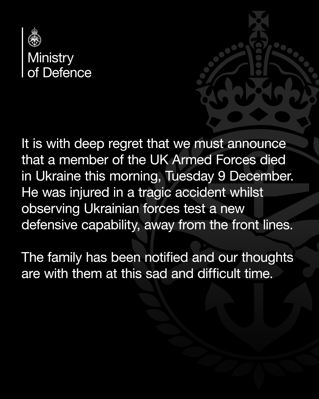 The Ministry of Defence has announced that a member of the UK Armed Forces died in Ukraine on Tuesday, 9 December, following what officials described as a “tragic accident” during a weapons trial conducted by Ukrainian forces.