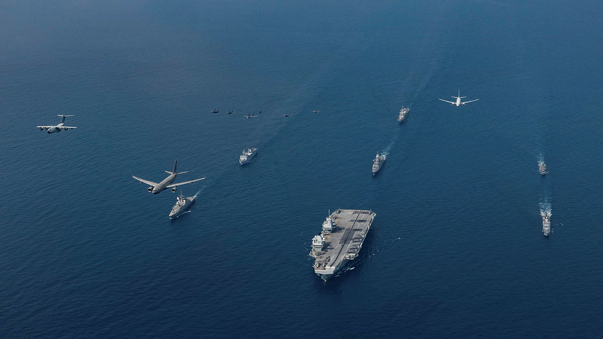 The carrier was accompanied by the Royal Australian Navy’s Anzac-class frigate HMAS Ballarat, the UK’s Type 23 frigate HMS Richmond, Royal Malaysian Navy ships KD Lekir and KD Sri Indera Sakti, and Republic of Singapore Navy vessels RSS Formidable and a Victory-class missile corvette.