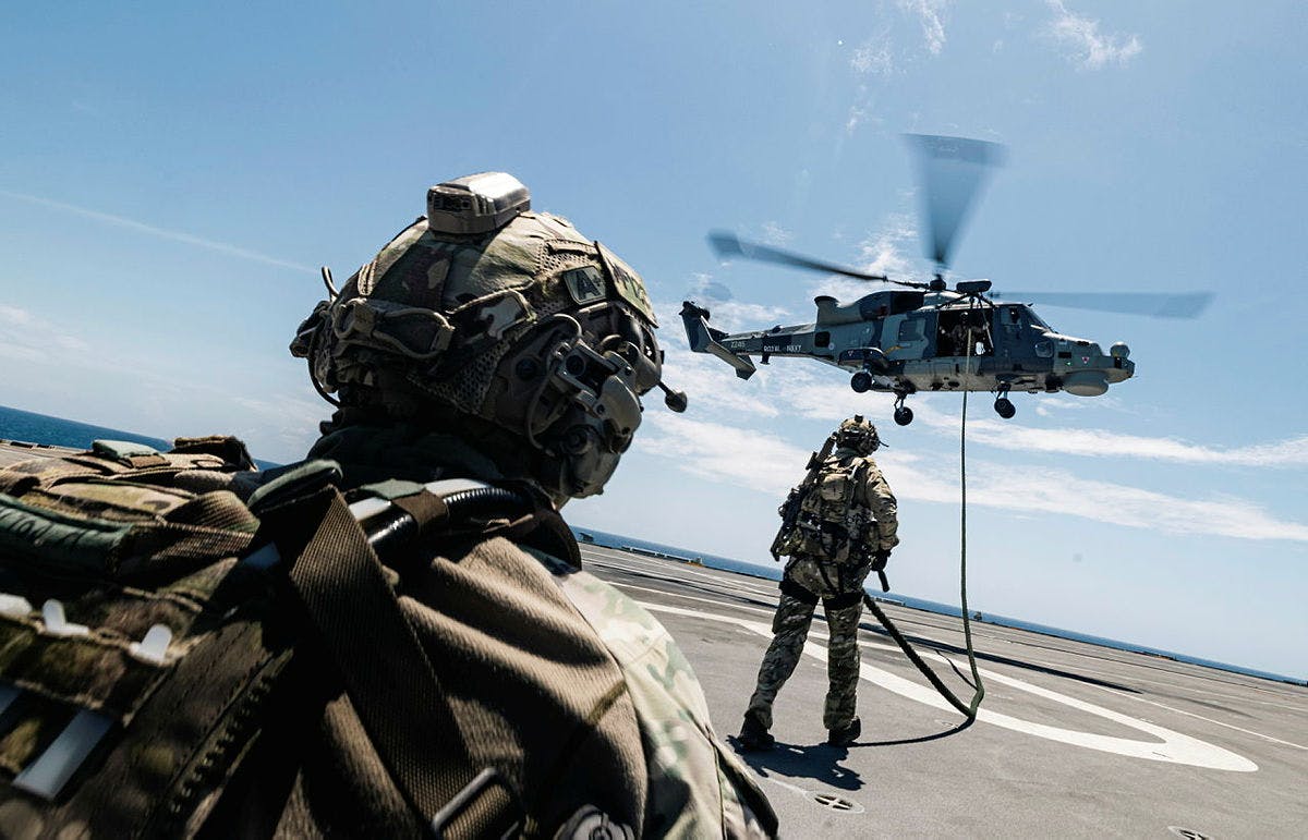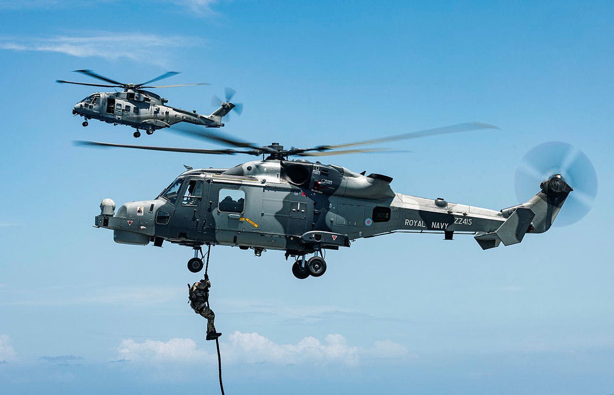 The Merlin and Wildcat helicopters, operated by Commando Helicopter Force, hovered above the aircraft carrier while Marines descended by rope to the deck. The technique, used when helicopters cannot land, allows for rapid insertion of personnel and is commonly employed in boarding operations and amphibious missions.