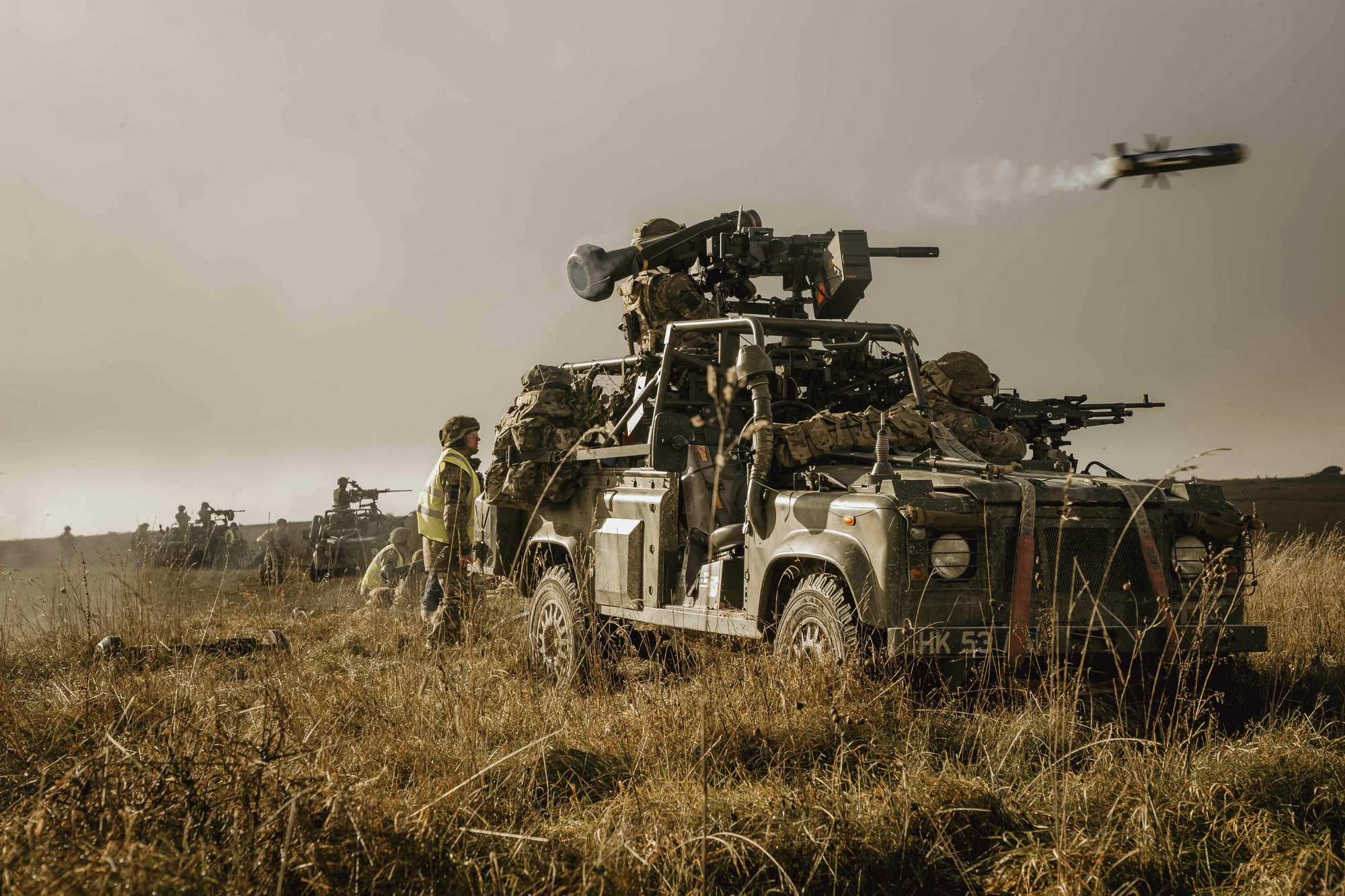 “As the culmination of a course in support weapons skills, paratroopers staged a firepower demonstration on Salisbury Plain. A fast-moving scenario saw an advancing force of enemy armoured vehicles engaged and defeated with Javelin and NLAW anti-tank missiles, 81mm mortar, Grenade Machine Guns, Heavy Machine Guns and General Purpose Machine Guns.