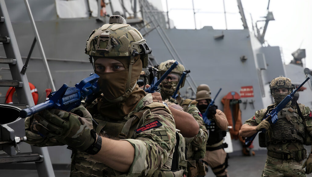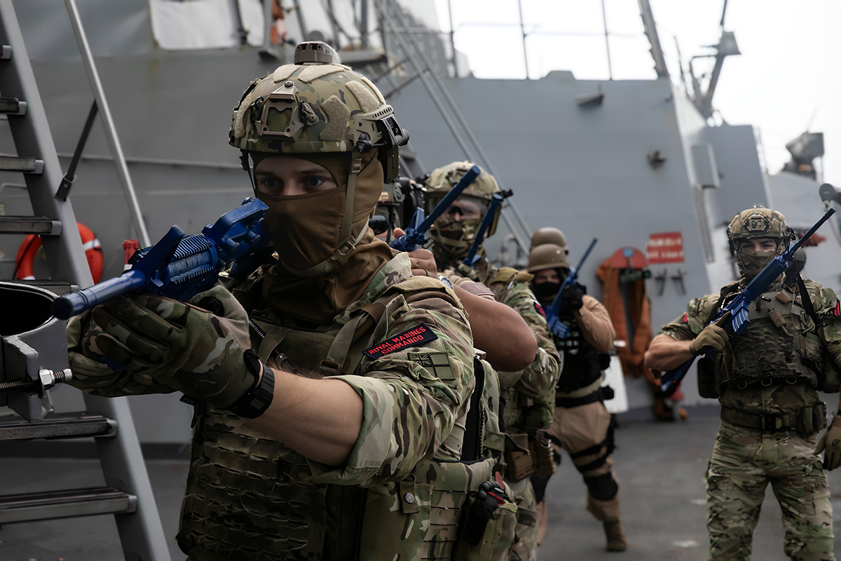 Royal Marine Commandos have conducted a visit, board, search and seizure (VBSS) drill aboard a United States Navy warship as part of joint maritime security training in the U.S. Central Command area of responsibility.