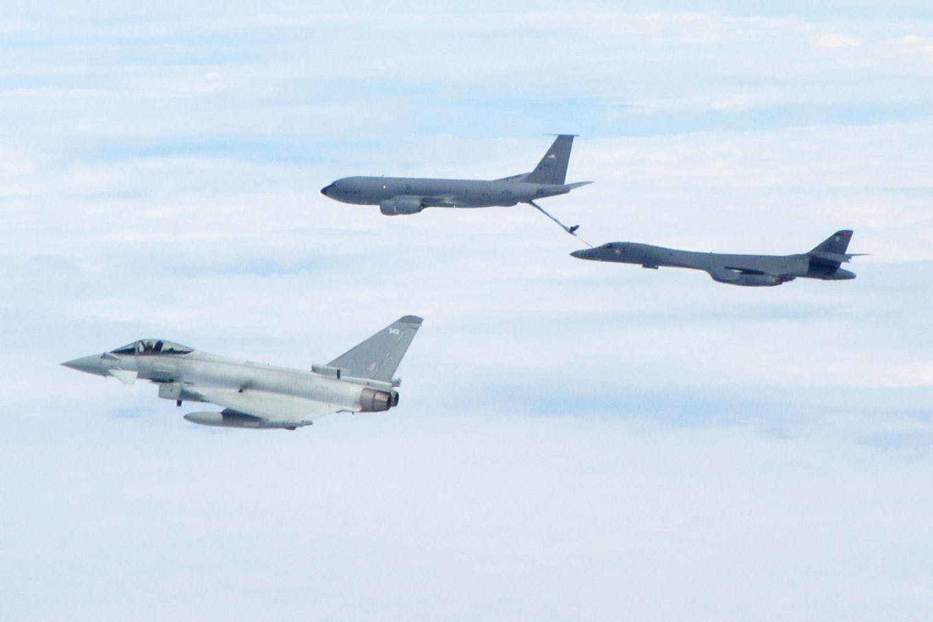“The US B1B Lancer bomber was conducting a long-range nonstop training sortie from the United States to mainland Europe and back. During the flight, Typhoons from 1(F) Squadron, escorted the US bomber over the North Sea, as it conducted Air to Air Refuelling prior to its return to the US across the Atlantic.