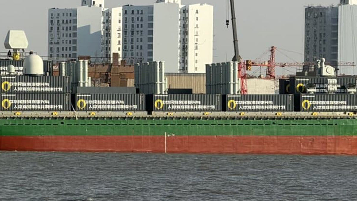 Recent images from Chinese social media show a standard commercial cargo vessel refitted with sensors, defensive weapons and containerised launchers.