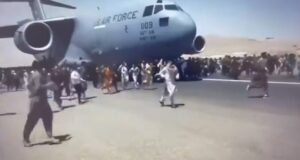 Footage has emerged showing Afghan civilians clinging to the undercarriage of transport aircraft leaving Kabul with a number appearing to fall from a C-17 while in flight.
