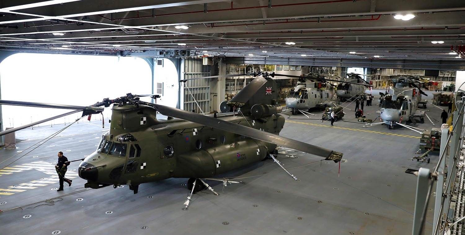I take issue with Daniele’s point about lift. On land yes, Chinooks can heft a lot. But the picture of the hangar gives it away, four Merlins for one Chinook. And there is a lot of space between the aircraft in that picture, if you were really loaded for war you could fit eight Merlins in that space. Check out some pictures of Hermes and Invincible in 1982 to see what can be done.
