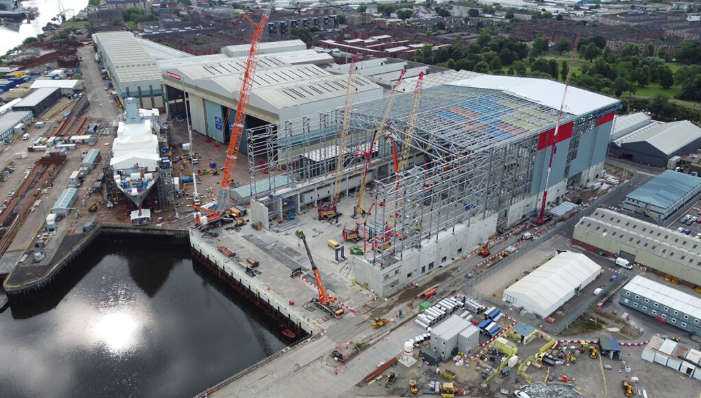 Exclusive drone footage reveals the rapid development of the new shipbuilding hall at BAE Systems’ shipyard in Govan, Glasgow.
