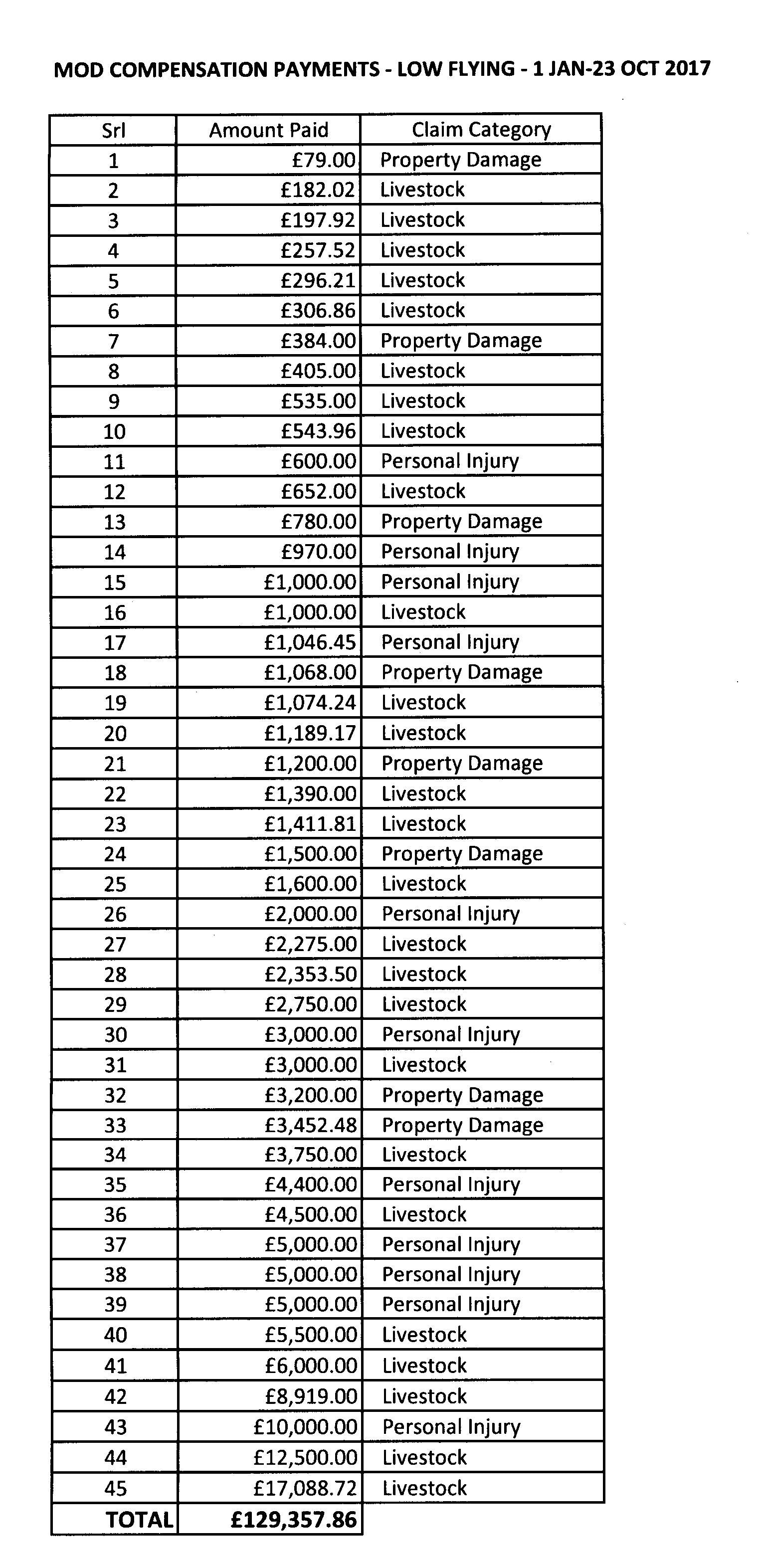 “Since January 2017 (until 23 October 2017) the MOD has paid 45 individual claimants a total of £129,357.86 for compensation claims arising from military low flying activity. The single largest payment in this period was £17,088.72. Individual payments are attached.