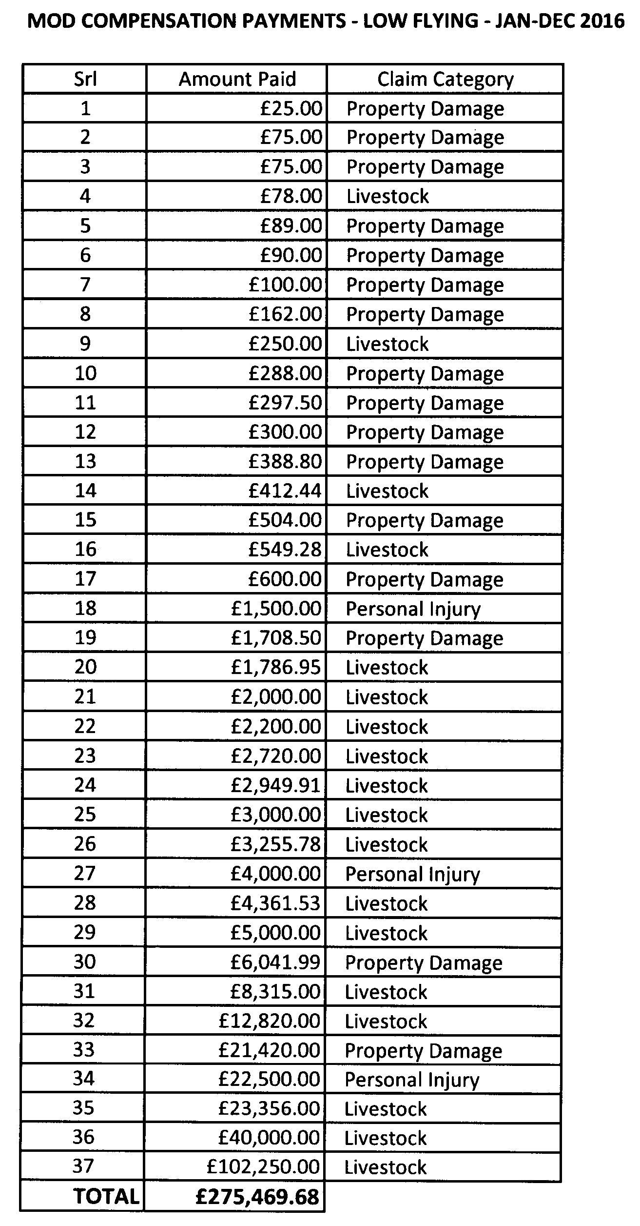 In 2016 the MOD paid 37 individual claimants a total of £275,469.68 for compensation claims arising from military low flying activity. The single largest payment in 2016 was £102,250.00. Individual payments are attached.”
