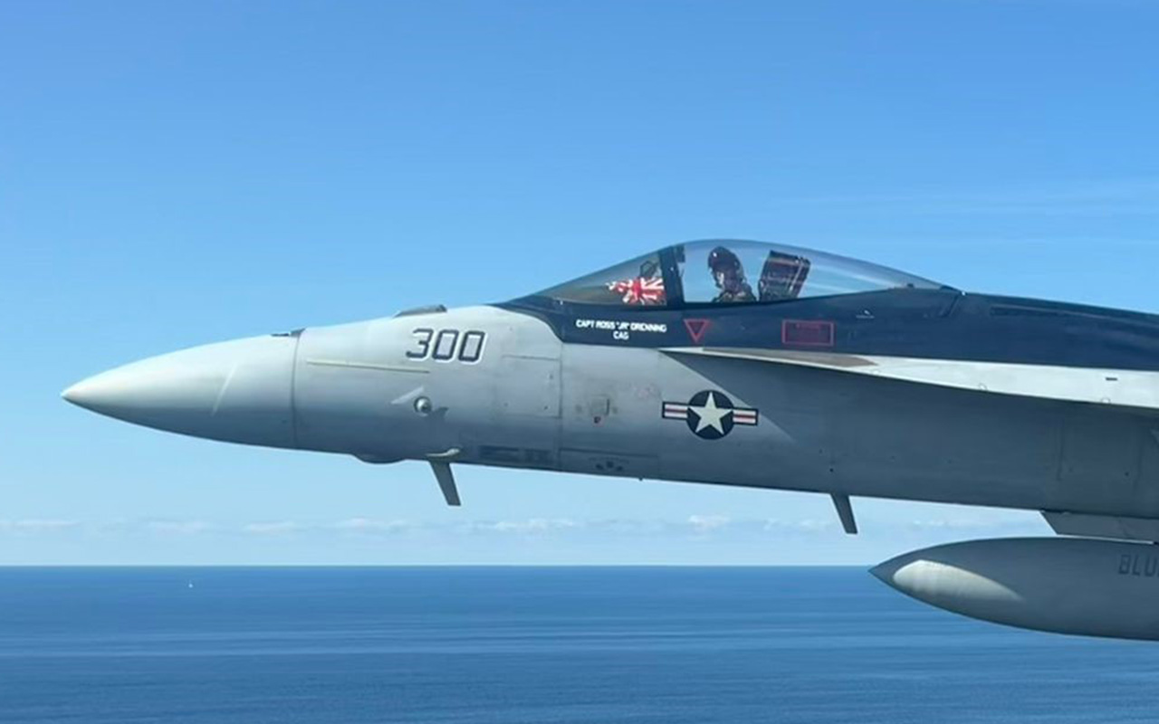 HMS Prince of Wales was treated to a flypast from an F-18 jet flown by a Royal Navy Pilot, flying the British flag.