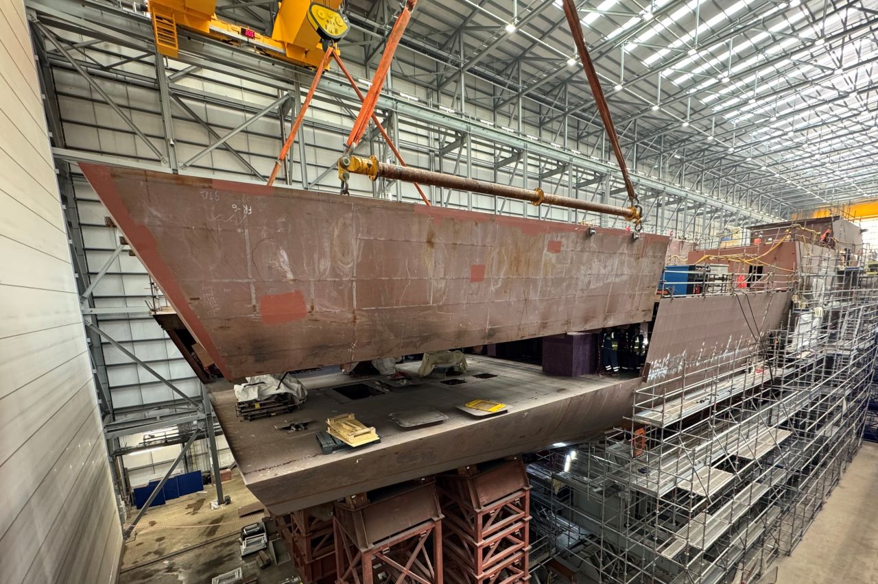 The operation, carried out at Babcock’s Rosyth facility in Scotland, marks the completion of the aft section of the vessel. With the flight deck structure now in place, work can continue towards the next major construction phase, referred to as the “drop stern.”