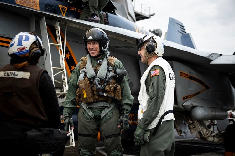 Sir Gwyn took to the skies in an F/A-18F Super Hornet from Strike Fighter Squadron 213, piloted by Lt Cmdr Chris Kapuschansky, as the jet flew over the world’s largest aircraft carrier during its ongoing deployment in the U.S. 6th Fleet area of operations.