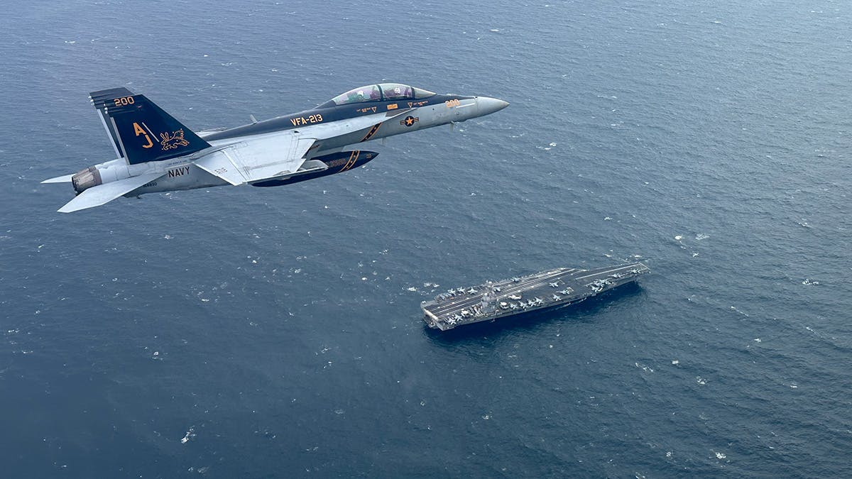 Sir Gwyn took to the skies in an F/A-18F Super Hornet from Strike Fighter Squadron 213, piloted by Lt Cmdr Chris Kapuschansky, as the jet flew over the world’s largest aircraft carrier during its ongoing deployment in the U.S. 6th Fleet area of operations.