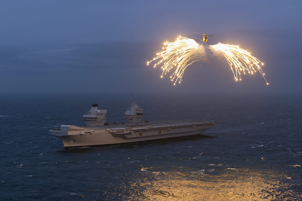 A Merlin helicopter from 820 Naval Air Squadron loaded and fired flares from HMS Prince of Wales, while embarked for Exercise Steadfast Defender.
