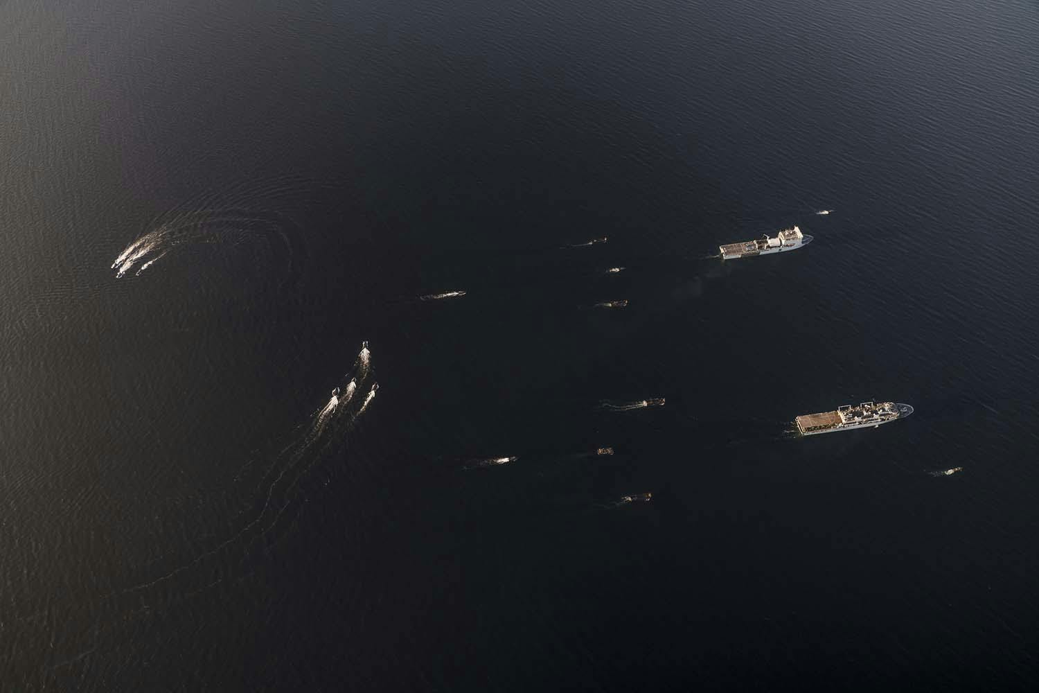 The ships – both of which are equipped and designed to support Royal Marines on amphibious operations – worked with Swedish CB90-class fast assault craft and amphibious hovercraft (LCAC(M)), the largest such craft to embark in Albion, on docking operations in Mysingen fjord (in the southern part of the Stockholm Archipelago).