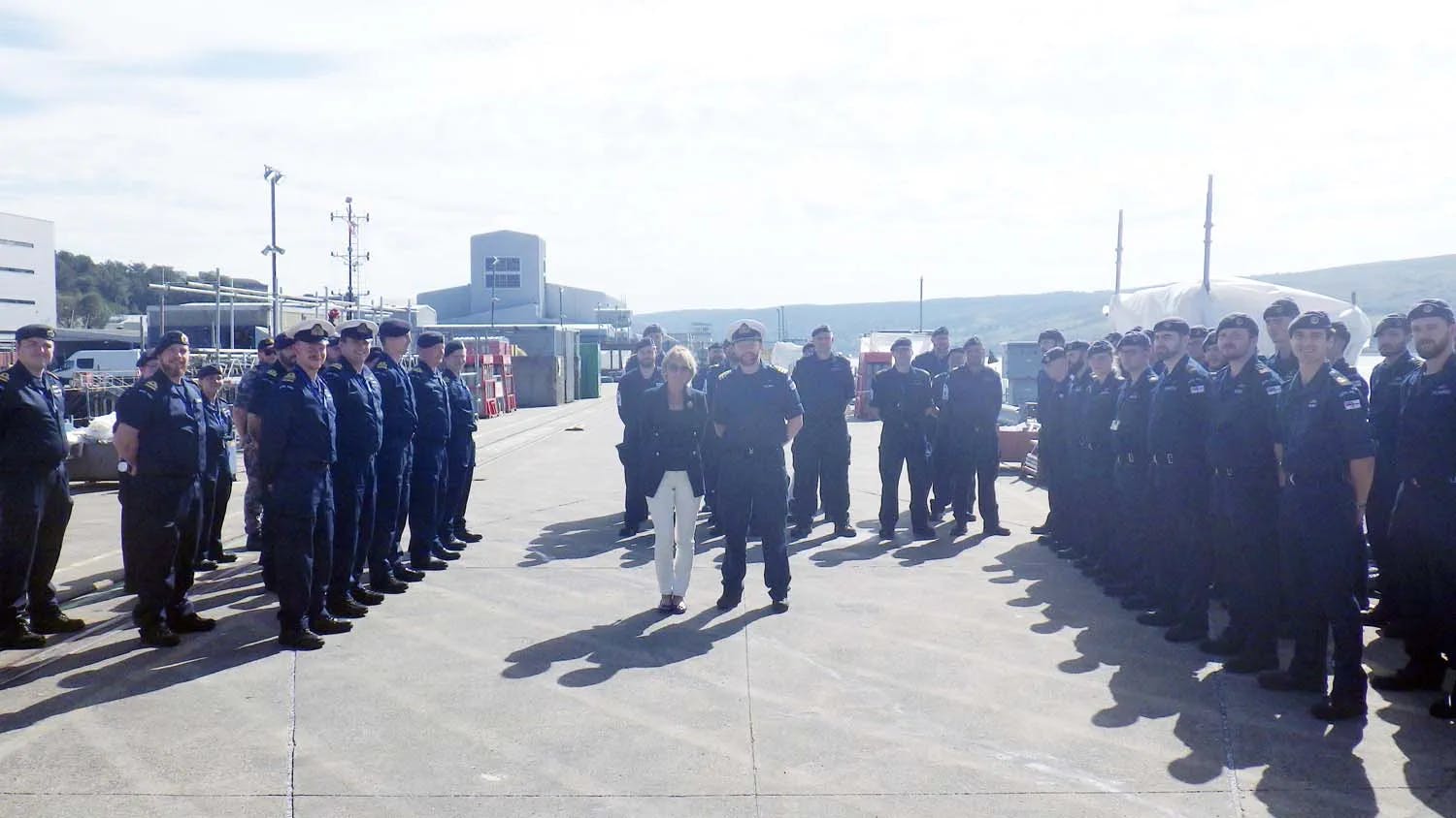 Lady Zambellas, wife of former First Sea Lord Admiral Sir George Zambellas, addressed the crew and presented several awards during her visit. Petty Officer Medical Assistant Sean “Dusty” Millar received a Herbert Lott Efficiency Award for his work on Exercise Laesa Nautae, a training activity designed to improve the ability of medics across defence to extract casualties from submarines.
