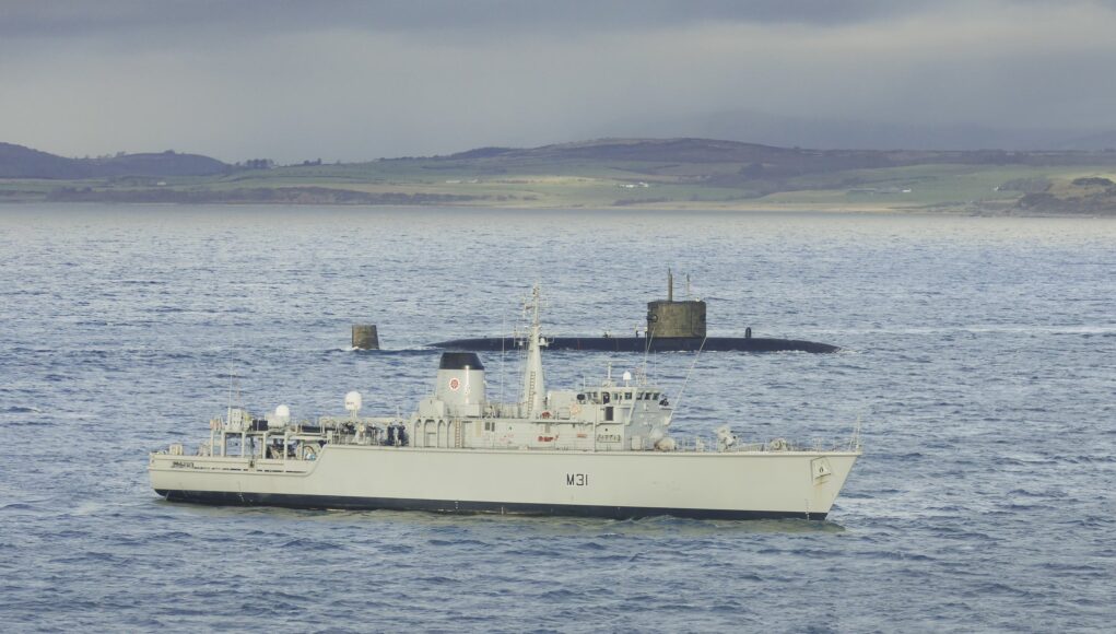 HMS Cattistock, one of the Royal Navy’s Hunt-class minehunters, recently worked with a nuclear submarine and a Merlin helicopter off the Scottish coast.