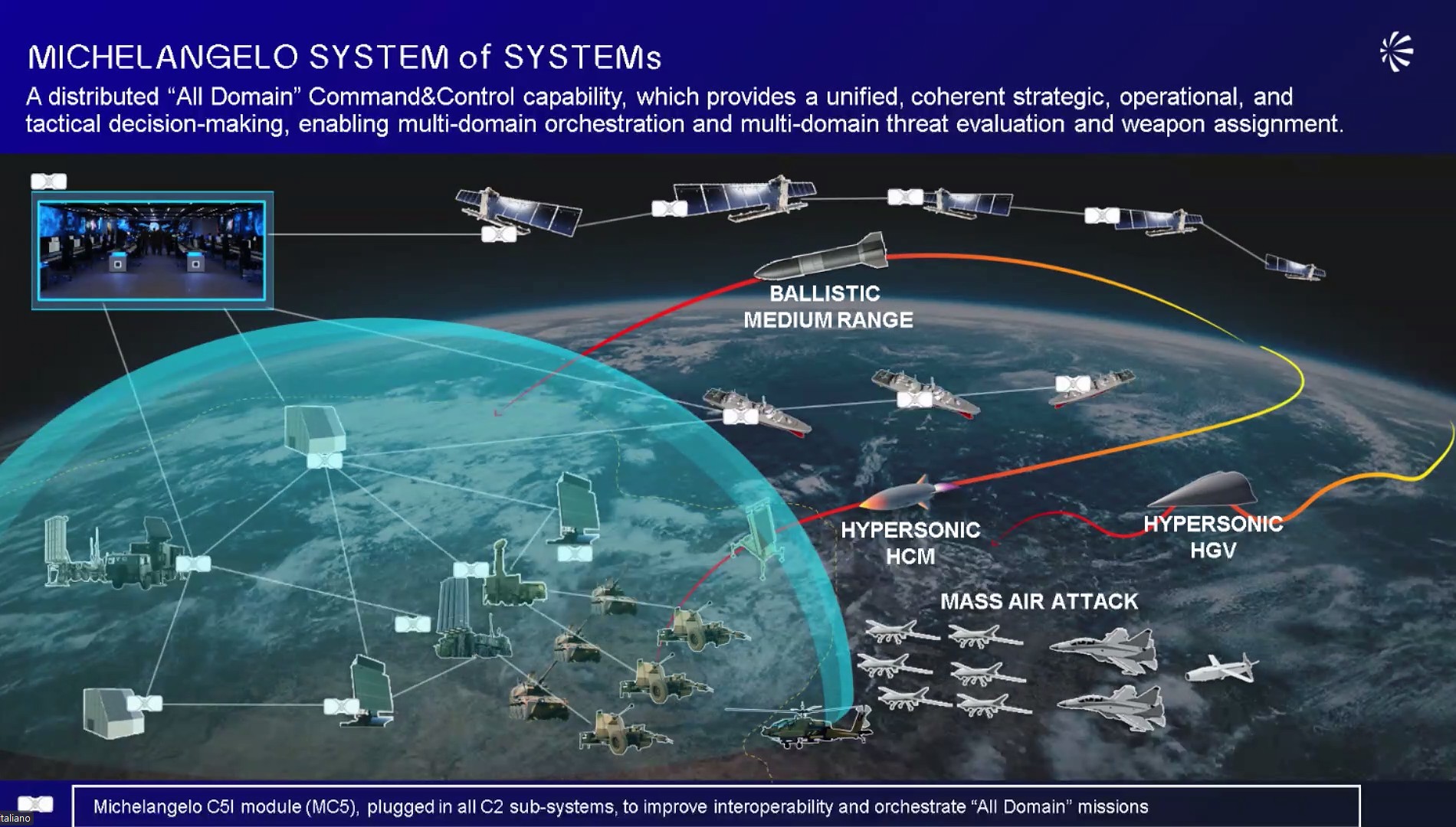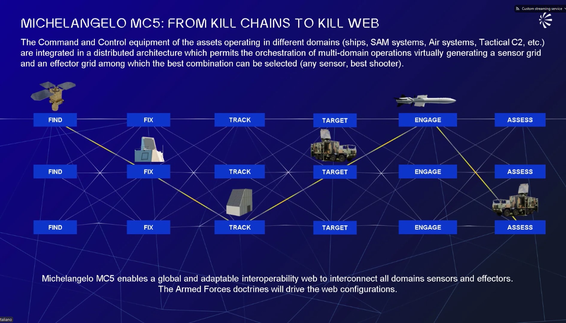 Most of his briefing focused on what he called a genuine multi-domain operating concept. Cingolani pointed out that older doctrines kept land, air and maritime assets largely separate. “According to the older technologies and doctrines, these assets would not communicate with one another. Each had its own task on land, in air, at sea.” The goal behind Michelangelo, he said, is to create the connective layer those doctrines lacked. “Multi domain means bringing together industrial policy, allowing us to have a portfolio of platforms which float, which are on land, which fly or which are in space.”