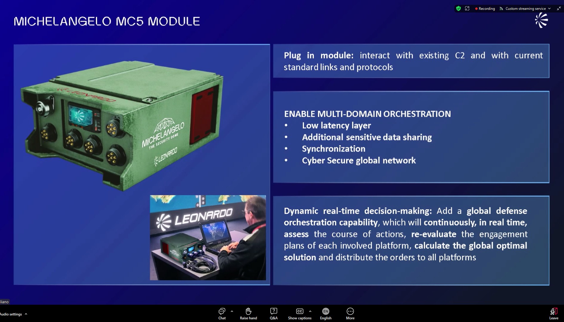 “We know that there are some European programmes that have been so lengthy that they are now standing still, so we decided to do something at national level, and we will make it available to Europe. It is an open program. It is open even from a technological standpoint.” His message remained that Michelangelo is intended to strengthen, not displace, collective efforts. “What we are proposing is additional. It’s not replacing anything. We can develop new software and hardware which add communication layers on existing assets, and this would be useful for the other program as well.”