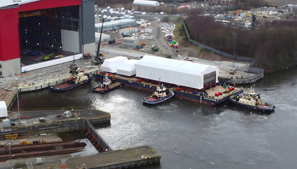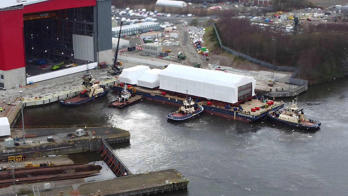 The 850-tonne lower propulsion block, built at Cammell Laird in Birkenhead, was transported by barge up the River Clyde before reaching the BAE Systems shipyard at Govan, where it will be consolidated into the growing structure of the ship.
