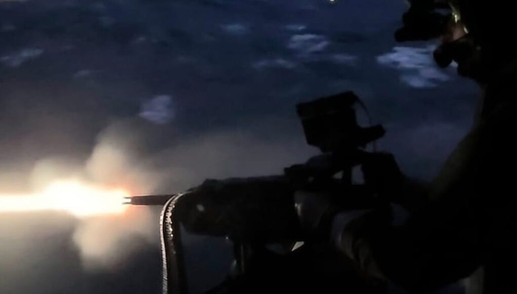 A Royal Navy Merlin helicopter of 814 NAS has carried out night-time gunnery training from HMS St Albans, with crews practising live weapons drills under low-light conditions as part of ongoing operational training.