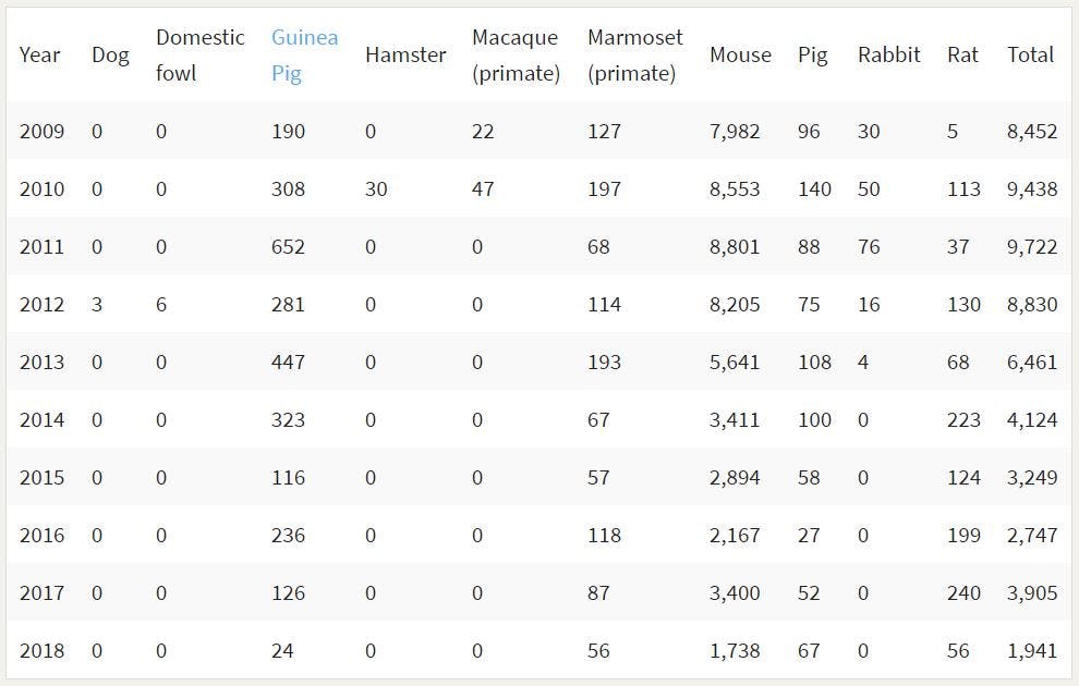 “The information requested is shown in the table below. Number of scientific procedures, by species, for the years 2009 to 2018”