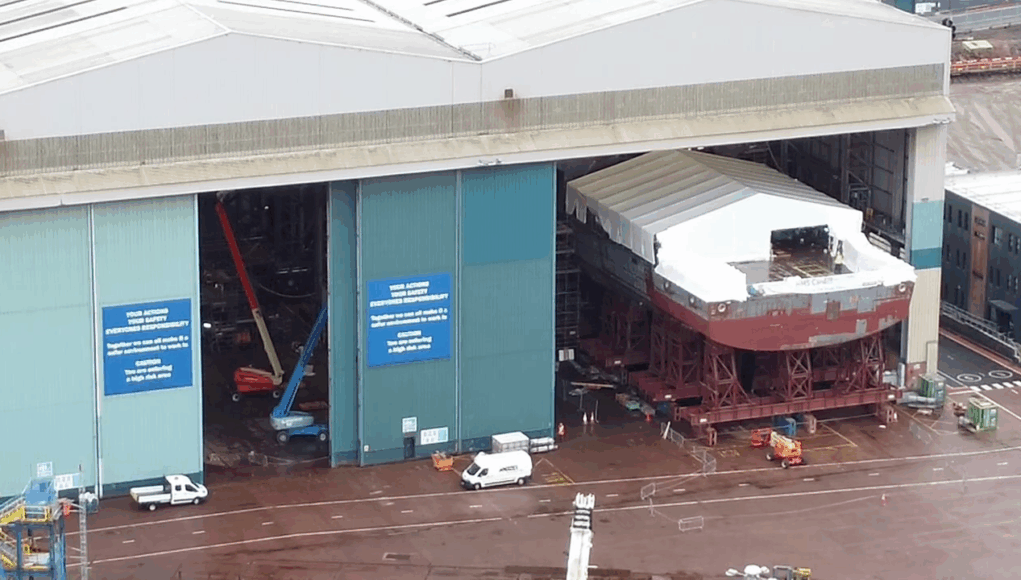 The aft section of HMS Cardiff is now poking out of the build hall at BAE in Govan, Glasgow.