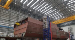 Imagery shows the first of five Type 31 Frigates, HMS Venturer, in her current state of construction at Babcock’s Rosyth shipyard in Scotland.