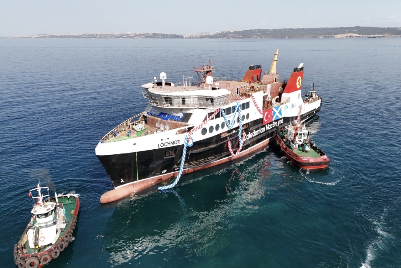 MV Lochmor was floated on 23 August at the Cemre Marin Endustri shipyard in Yalova. She is the first of a pair of sister vessels, alongside MV Claymore, ordered to replace the ageing single-ship service of MV Hebrides between Uig on Skye, Tarbert on Harris, and Lochmaddy on North Uist.