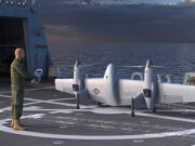 This VTOL UAS, which takes off and lands on its tail like a helicopter, transitions to horizontal forward flight for long-endurance missions.
