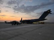 A Royal Navy Wildcat helicopter has been delivered to the Middle East by a Royal Air Force C-17 Globemaster, supporting the ongoing deployment of HMS Lancaster as part of Operation Kipion.