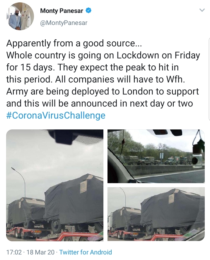 In addition, the Armed Forces are on standby to assist with civil emergencies and the MoD are deploying nurses, surgeons and other healthcare trained personnel to assist where required.