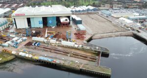 The former ‘wet basin’ has now been filled in preparation for the construction of a massive shipbuilding hall, representing a considerable increase in capacity for Scottish shipbuilding.