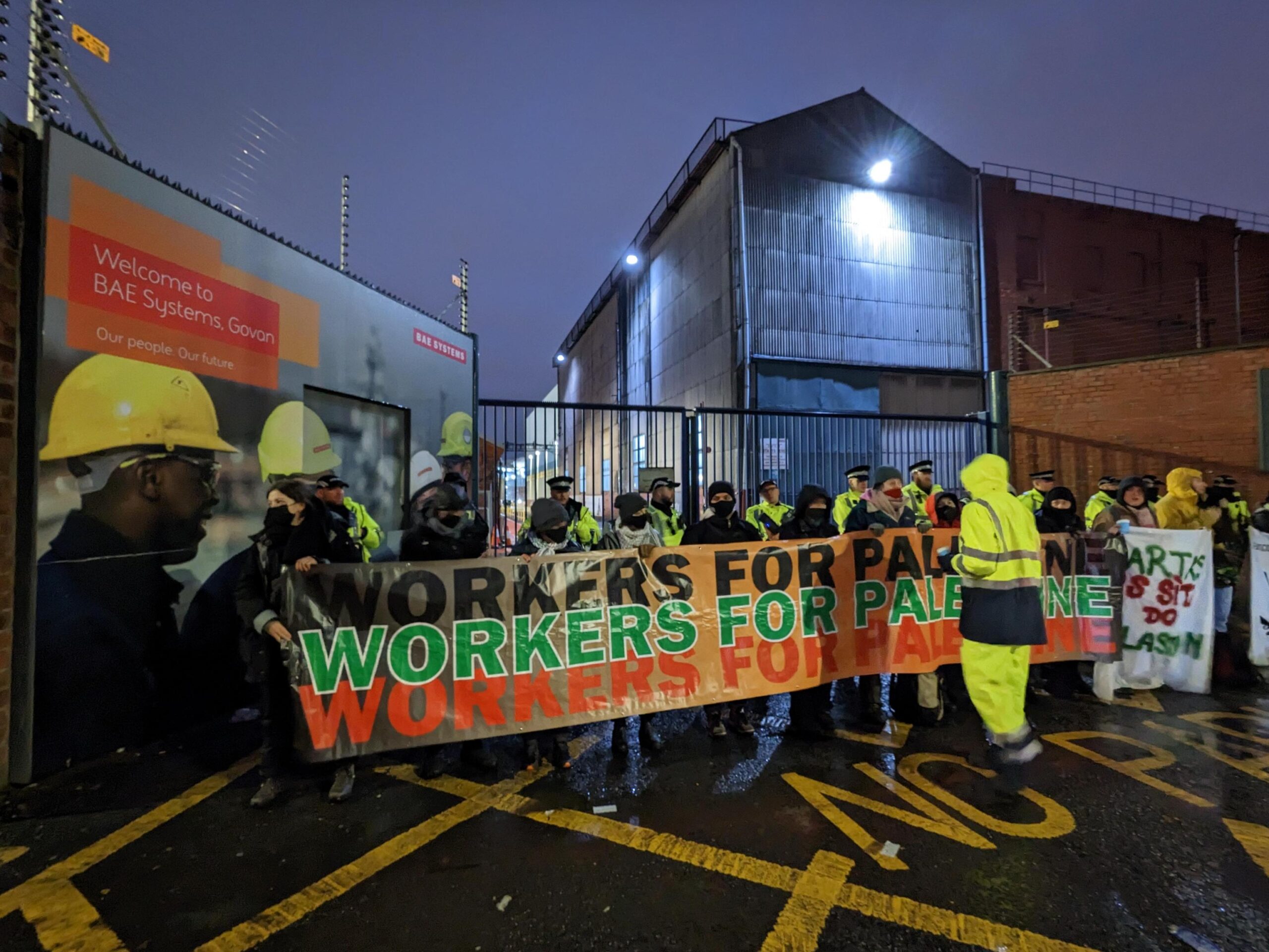 Protestors have blocked the gates to BAE Systems shipyard in Govan in an effort to “shut down sites which produce components for the F-35 fighter jet”.