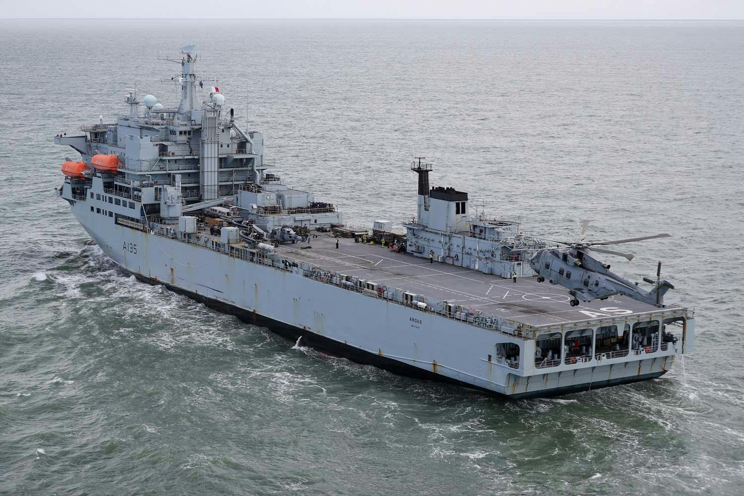 Argus has most recently been involved in disaster relief operations in Honduras following the devastation of Hurricanes Eta and Iota. Twenty-four tonnes of food, fresh water and shelters in 101 underslung loads were flown into aid stations from Argus by the Commando Merlin helicopters of 845 Naval Air Squadron.