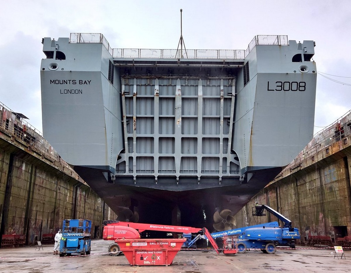 Currently situated in a dry dock at Falmouth’s shipyard, RFA Mounts Bay is undergoing extensive care to its external hull. The maintenance work highlights the ship’s design, providing observers with a rarely seen glimpse of the vessel from below the waterline. The ship’s powerful azimuth pods and stern door have become the center of attention.