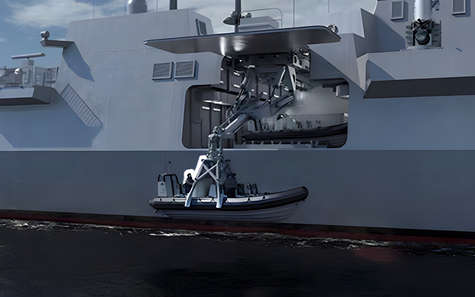 None of the pretty pictures I’ve seen include an obvious counterweight mechanism. We are talking about a maximum of 15 tonnes put at 16m from the centreline. That’s the equivalent of a a couple of similar containers stored near the edge of the ship, say 8 or 9m from the centreline. Is that a big issue for a large frigate? I wouldn’t have thought so.