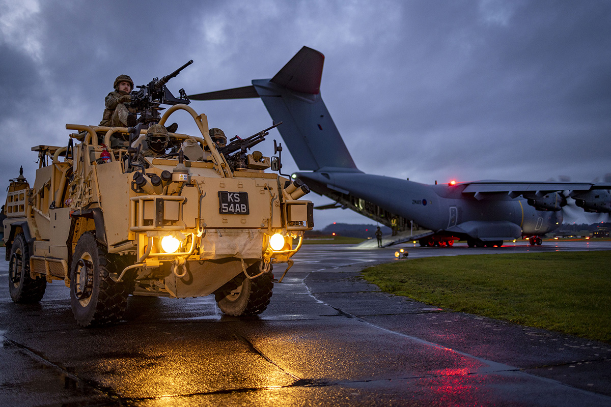 During the exercise, troops from 1 R IRISH were involved in loading and securing Land Rovers and Jackal patrol vehicles onto the aircraft, followed by practice drills focussed on swift disembarkation and readiness for immediate action upon landing.