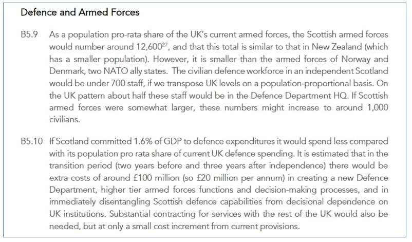 There are some other defence-related lines in the report which appear to have been drafted by a PR agency rather than a defence economist. For example, there is a suggestion that there would be benefits at the point of separation because defence activities to which Scotland contributes currently take place outside Scotland [13]. Is the implication of this really that soldiers shouldn’t go on defence missions outside their home country, or that the putative (Royal?) Scottish Navy would only patrol within coastal waters? Perhaps the SNP don’t value our current garrisons in Cyprus, Gibraltar, the Falklands and elsewhere; but are they really suggesting that we wouldn’t have strategic bases and multinational exercises outside Scotland, and that this would be a sensible way to make savings, or to afford home-based forces?